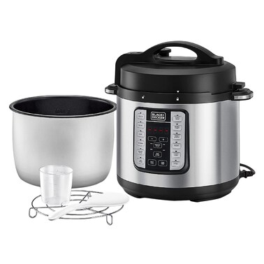 Black+Decker PCP1000-B5 Smart Steam Pot Electric Pressure Cooker for a variety of cooking possibilities Cook for up to 8 people with the 6L capacity Aesthetic look to fit into any household with the brushed stainless steel housing 1 touch selection of popular recipes with the 12 smart programs Steaming food at the right time with 20 hours of cooking time and a 4 hour delay timer Easy operation with the Digital LED display 9 Safety mechanisms for user safety.