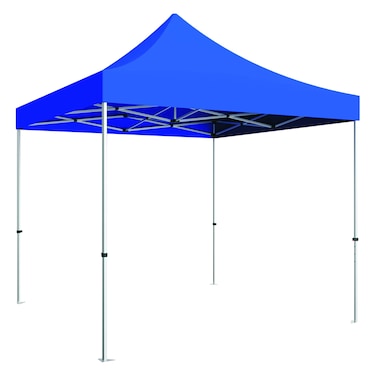 3m x 3m Blue Heavy Duty Pop Up Gazebo The 3m x 3m pop up gazebo range has a new colour just arrived; the navy blue! Due to popular requests we have added this colour to our gazebo range. It is a slightly darker option that we previously carried in the Royal blue, allowing you to match your business or club colours more accurately. Heavy Duty Frame Using our heavy duty pop up gazebo frame gives you a stand out gazebo with a strong sturdy construction. Poptents heavy duty pop up gazebos are made from 2mm thick aluminium and with 40mm square reinforced legs and 30 x 15mm roof bars you can be confident the bars can handle serious pressures without bending or buckling. This in combination with solid aluminium joints gives a strengthened pop up gazebo that can take the weight of 2-3 men; thus showing the forces it can withstand. Spring loaded centre poles add a dampening effect to the roof in strong gusts whilst easy glide sliders allow you to pop the gazebo up in less than 1 minute, using only its own weight. Gazebo Fabric Poptents fabric uses 600D, 420gsm PVC coated polyester which gives all our fabric 100% waterproofing, UV resistance and is also flame retardant (email for certificate). The sidewalls join to the inside of the roof and the legs of the frame using industrial velcro straps. All sidewalls also join together by zip in the corners, giving you a complete weatherproof join. The four full sidewalls are included; if you wish to swap one for a clear side you can select “Mix Your Colours” above and change the one to clear with an additional charge.
